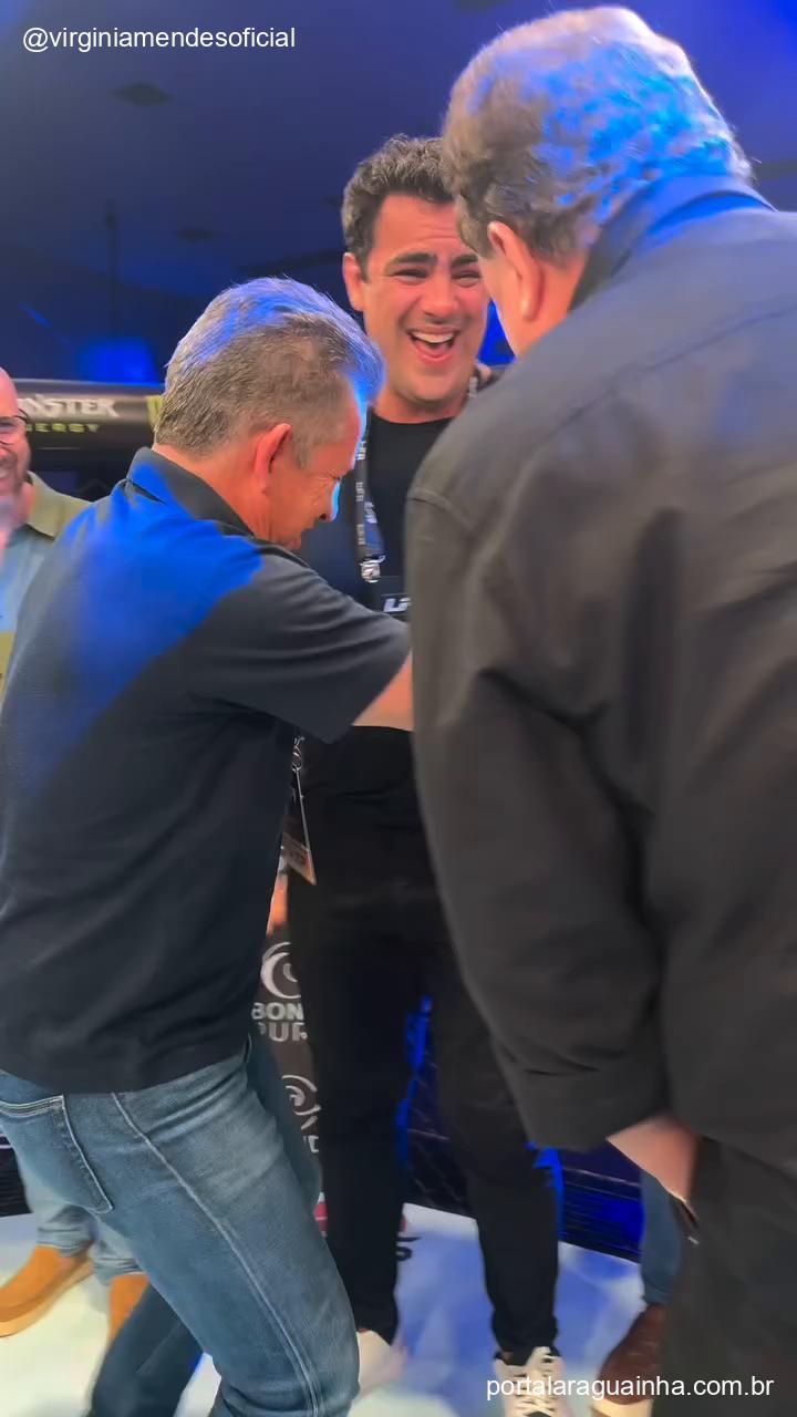 A cena, que parece ter acontecido nos bastidores de um evento de MMA em Mato Grosso, mostra o governador tentando aplicar um golpe de judô em Moura, que, com sua experiência e físico impressionante, não dá a menor chance. A descontração é visível, e a brincadeira arranca risadas de todos os presentes, incluindo a presença ilustre de Rodrigo Minotouro, lenda do MMA, que não segurou o riso.